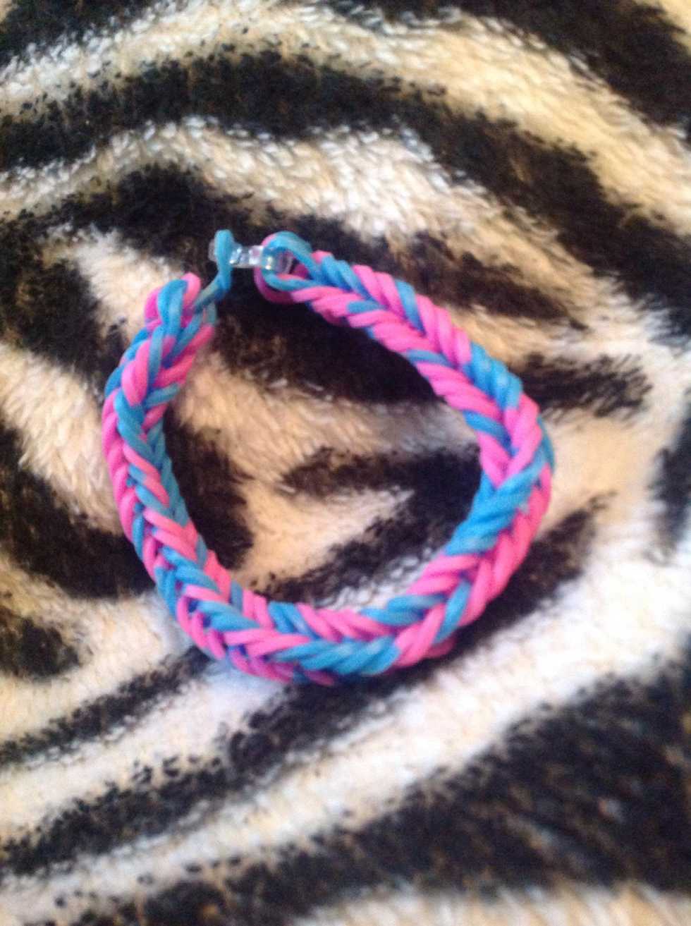 get a closepinput the first Elastic on and twist it like thisadd two more bands on topbring the bottom band over to the middle on both sideskeep on doing thatit will look like this at the end..
