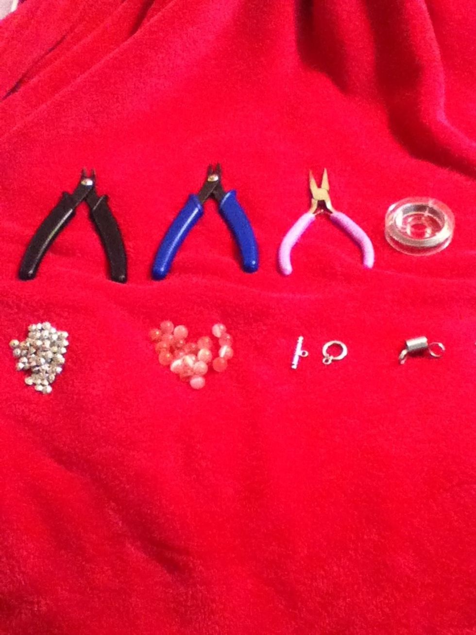 These are your supplies from top left to bottom right (wire cutters, crimper, jewlery pliers, wire, my spacer bead, main beads, clasp, pincher ( thats what i call it), 2 crimp beads (there very small)