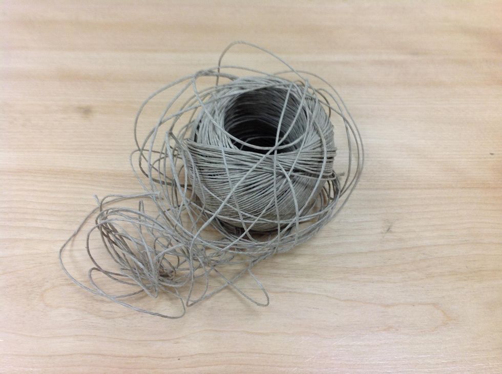 Start by folding your hemp in half (equal lengths on both sides) and tying a knot at the top (should have four separate strings now), leaving a loop at the top.