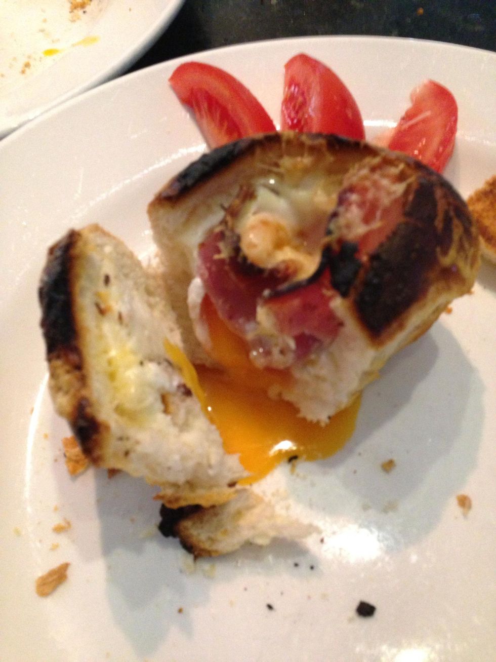 Any buns will doCut a hole in them like thisLine with ProsciuttoCrack in the eggsKeep the cut outsStick in the ovenAfter a few minutesSlice in to bit sizesToast the cut outsEnjoy
