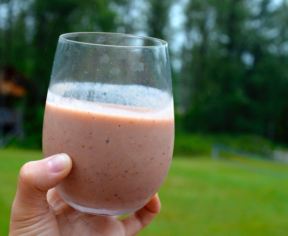 Add 1/4 cup of nonfat milk and six ice cubes. Thoroughly blend on high for two minutes!