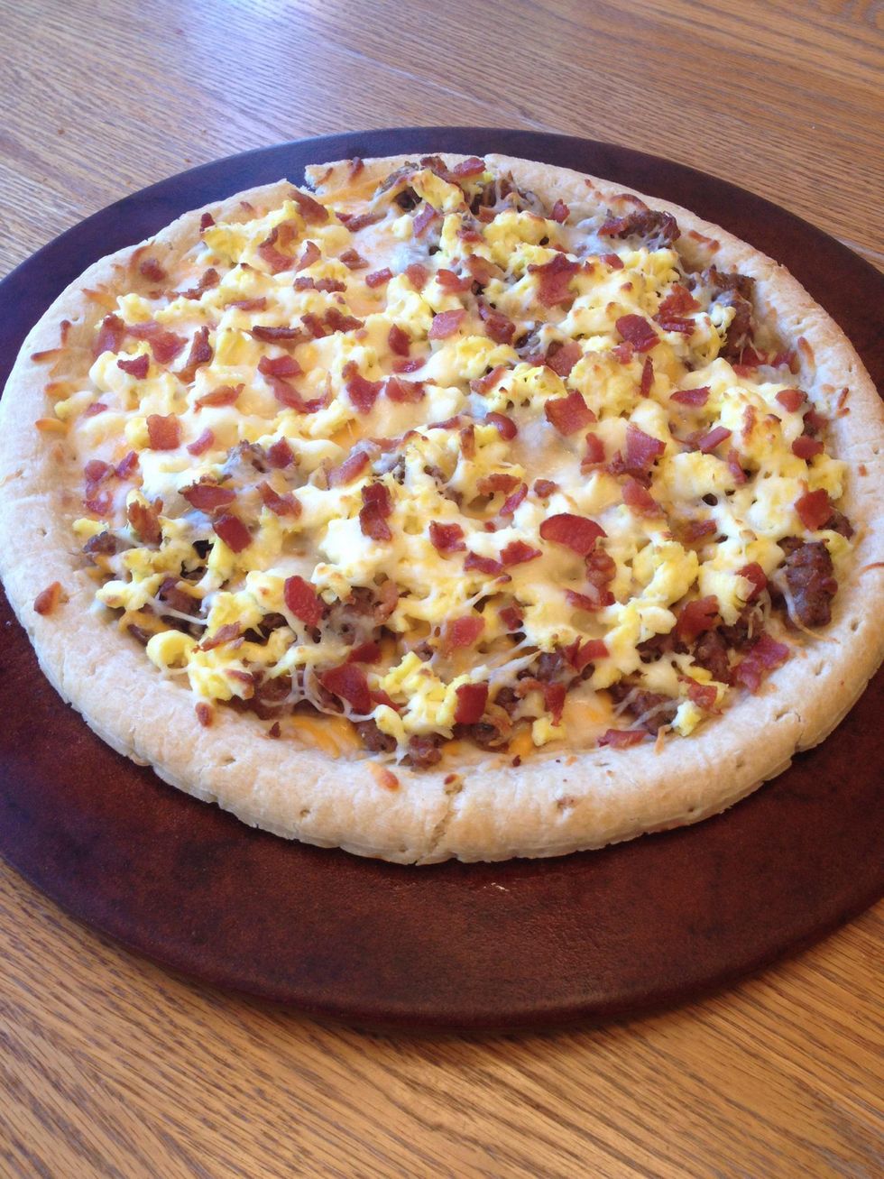 Cook bacon slices and crumble over top of pizza. Place in oven and bake until cheese is melted and edges start to brown.