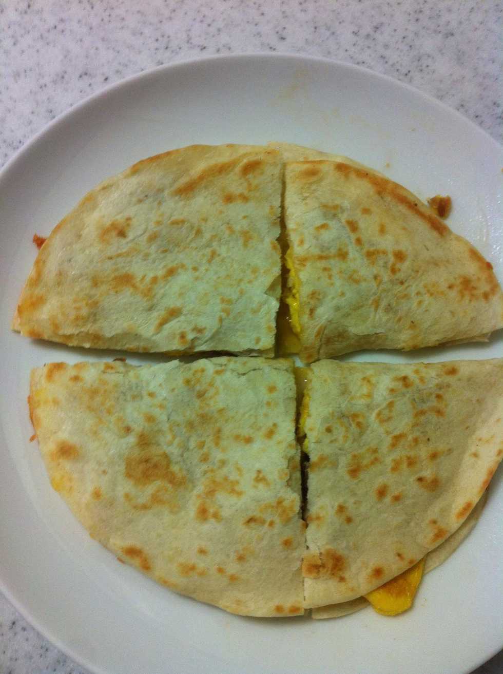 Place more cheese on top of the egg and the other tortilla. Then flip it over
