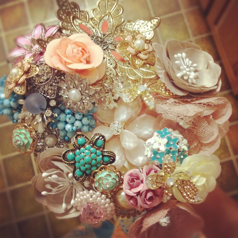 Find earrings broaches and rings that you would like to include in your bouquet .