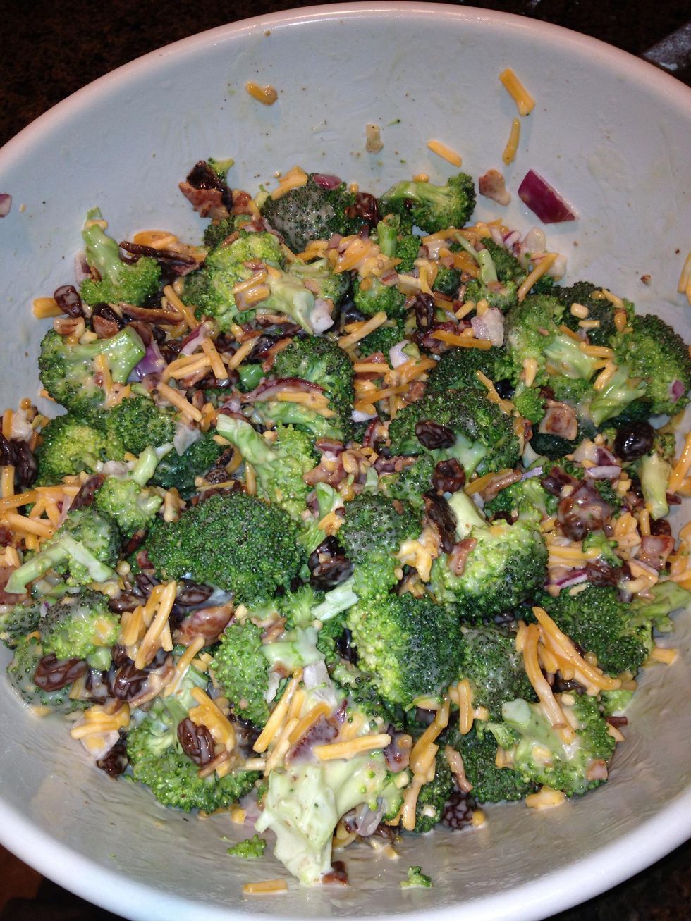 Broccoli salad is a sweet, tangy and delicious salad, good for holiday meals or summer BBQs. This recipe serves 10 people.