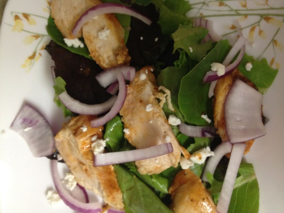 to build salad: start with a layer of lettuce, place a few chicken slices on top, sprinkle with onion and goat cheese! enjoy your yummy meal!