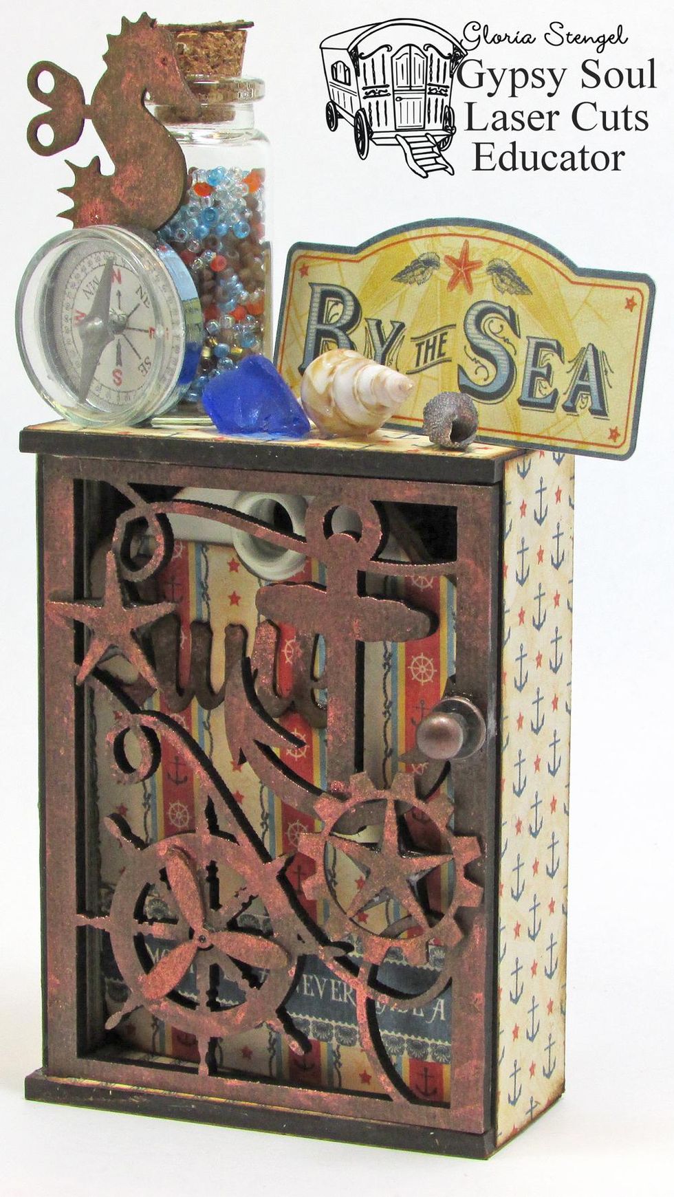 Fill a small bottle with beads. Glue bottle and other embellishments to the top of the box.