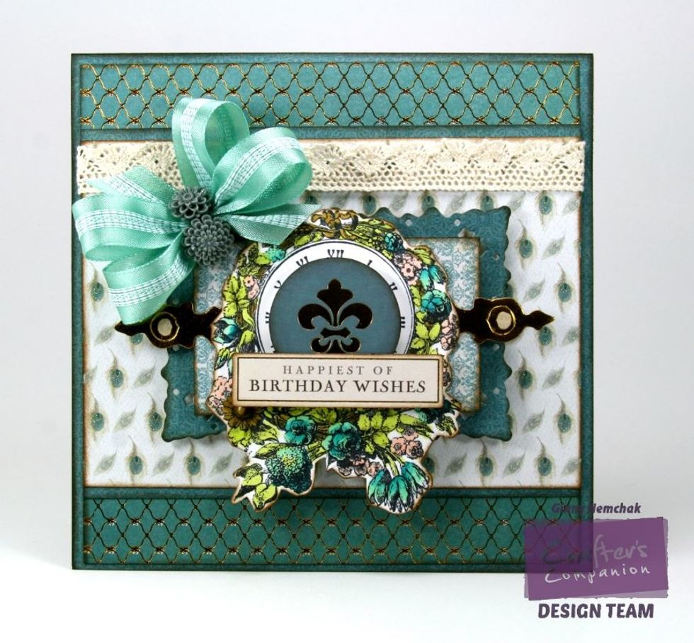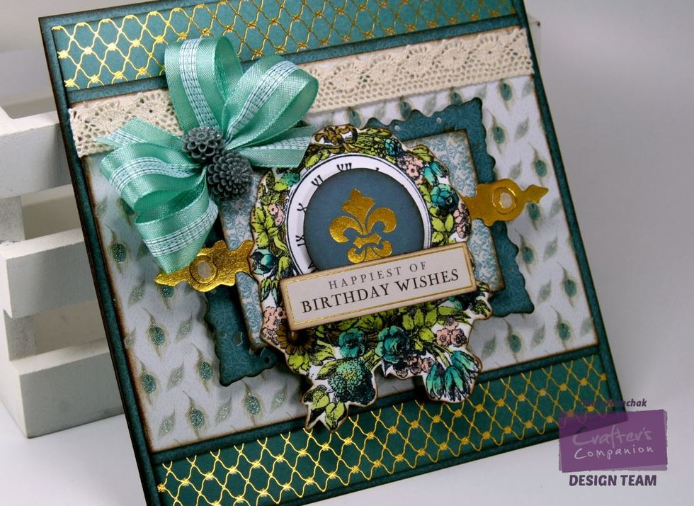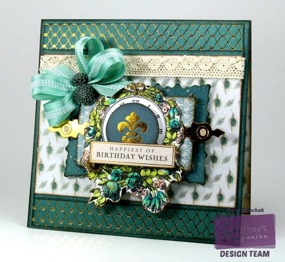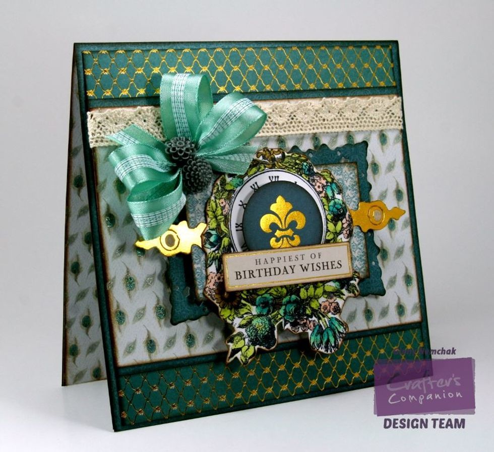 Add a circular foiled element and Birthday Sentiment from the Downton Abbey Card Kit.