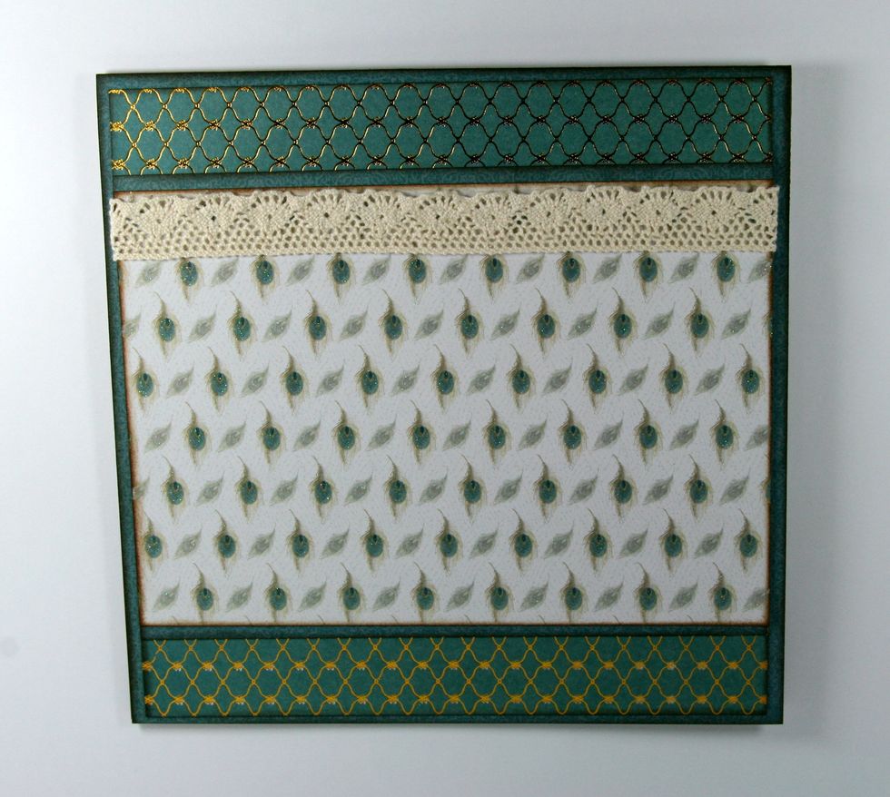 Trim a smaller piece from the patterned paper and adhere with foam spacers to die cut frame.
