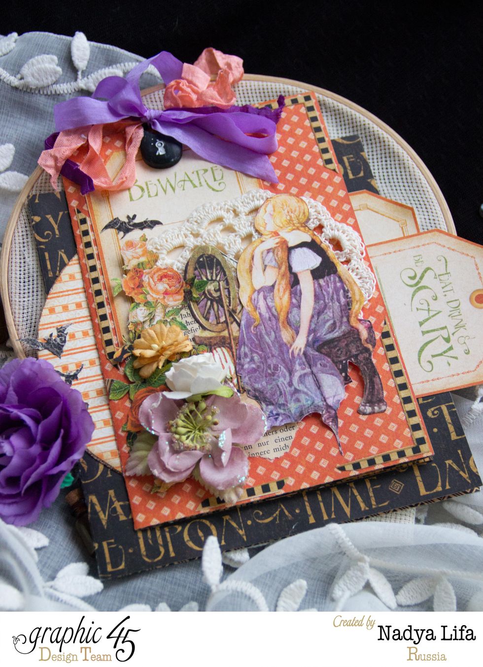 You need to do a next card (size:12/18 centimeters) from Graphic 45 An Eerie Tale Wicked Whimsey paper. Glue it to the first card, make only two strips of glue - at the bottom and on top.