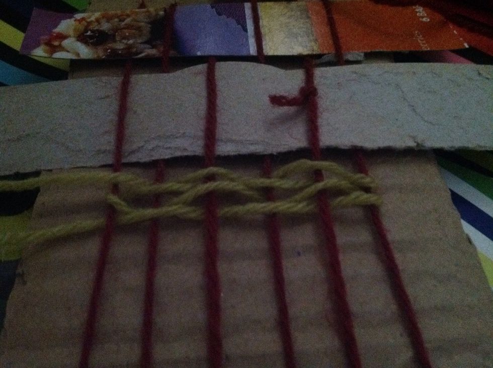 Start by going under then over the yarn to create weft Every row will be opposite. You can use up cycled box cardboard,make decorated strips of paper or yarn