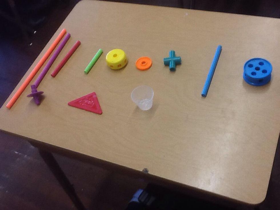 Step 4B:Assemble the launcher by putting one intersection with a blue stick through one side and one orange stick on one side and a green stick with a yellow wheel attached to it.