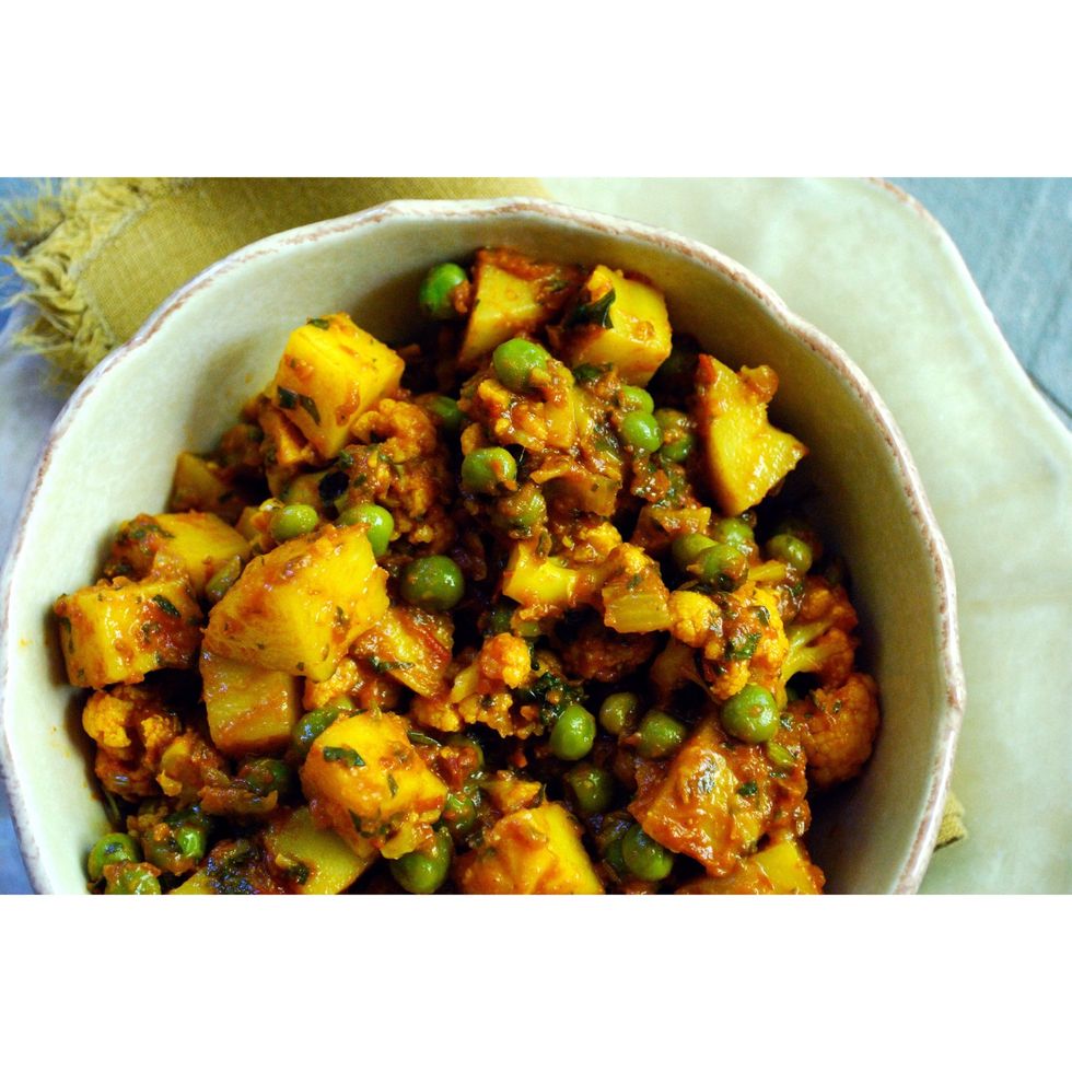 Gather all of your ingredients. Chop one head of cauliflower and 5-6 potatoes into bite-size pieces. Dice 1/2 an onion, 1 tomato, and a pinch of cilantro..then set aside.