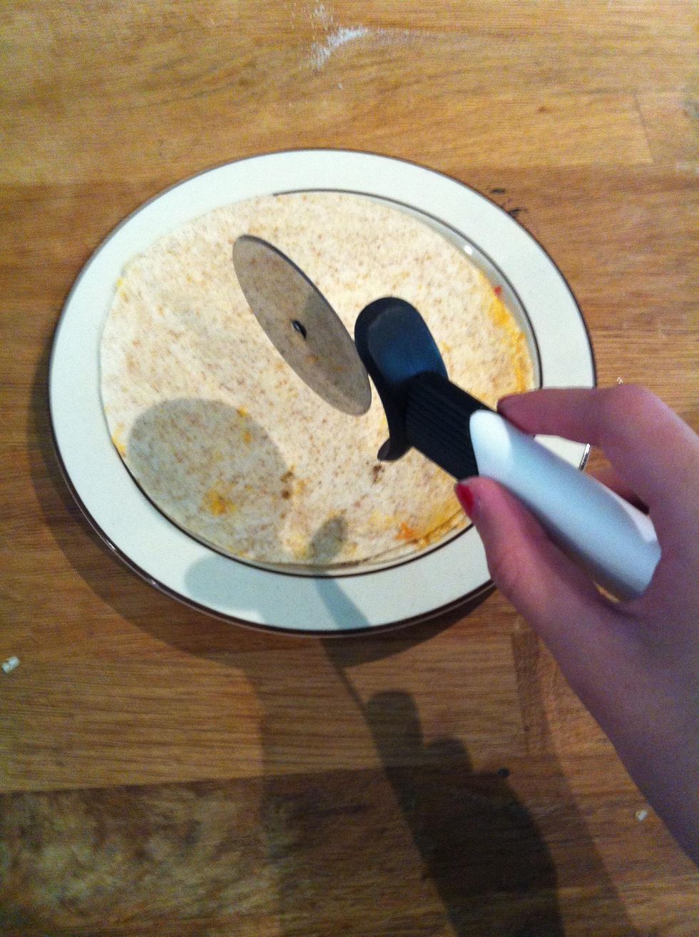 When the cheese melts, remove the quesadilla from the pan and place it on a plate. Then you can cut it with a pizza cutter or a knife.