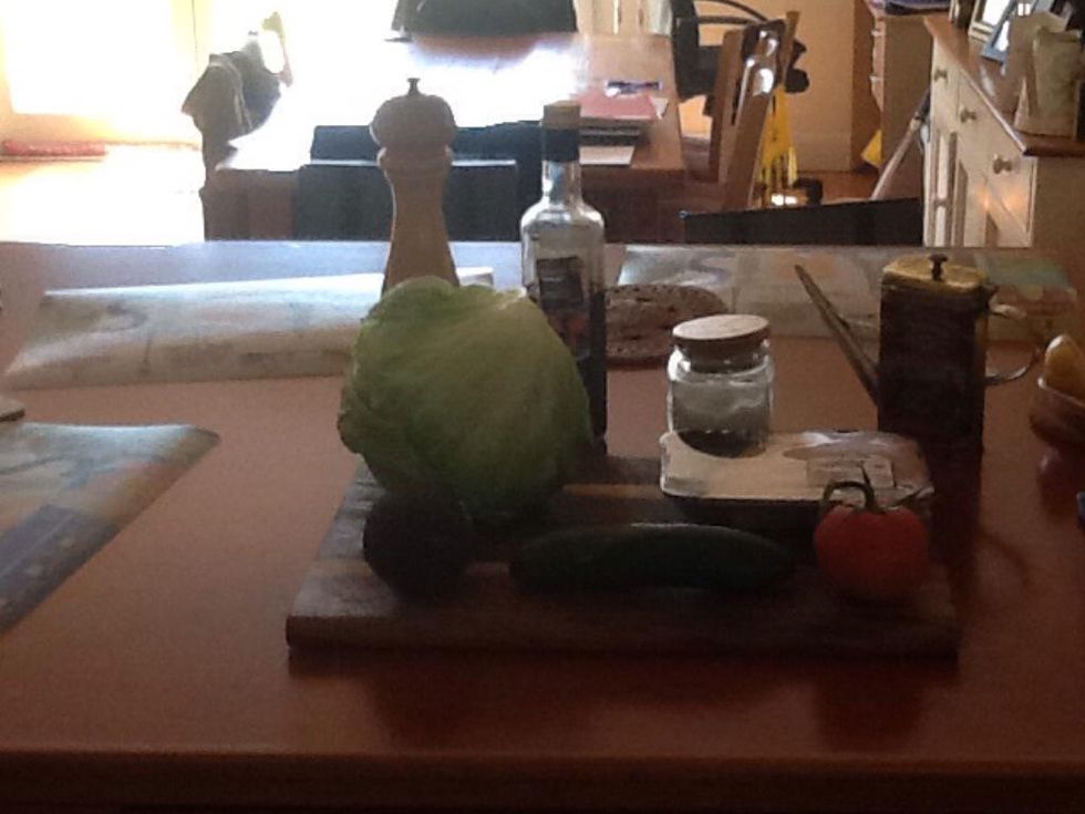 These are the ingredients used to make a Chicken Salad. Firstly, at the back, we have pepper, balsamic vinegar, salt and olive oil. Then we have lettuce, chicken, avocado, cucumber and tomato.