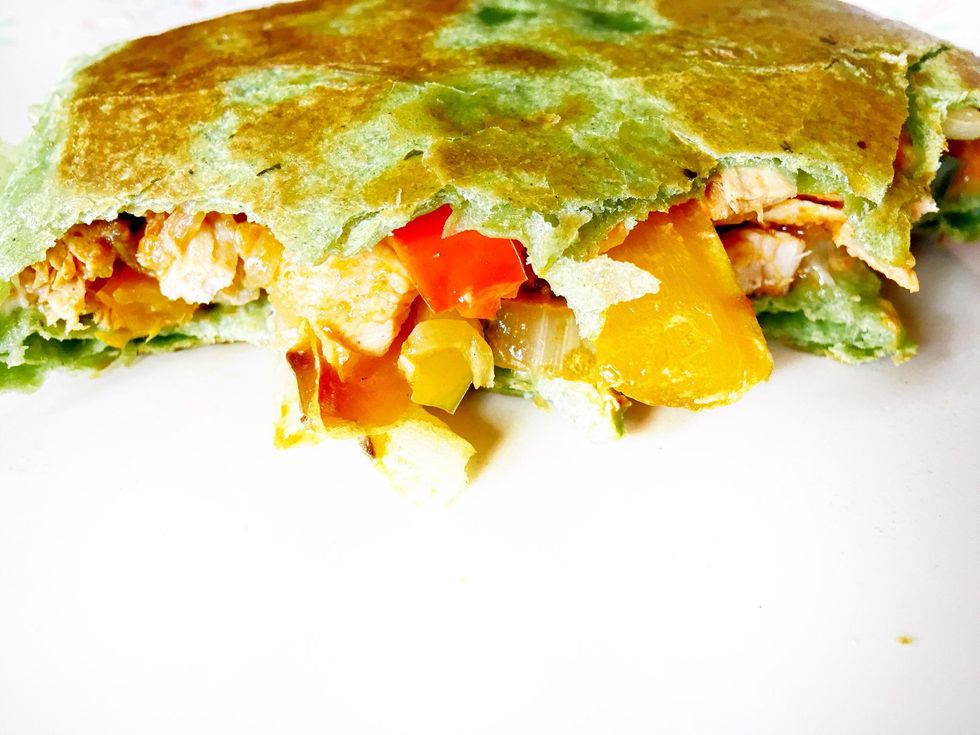 Use a large wrap. Apply mayo, sriracha, avocado/mango spread or any other flavor booster. Put 3/4 c of chicken/veggie medley and top with cheese.