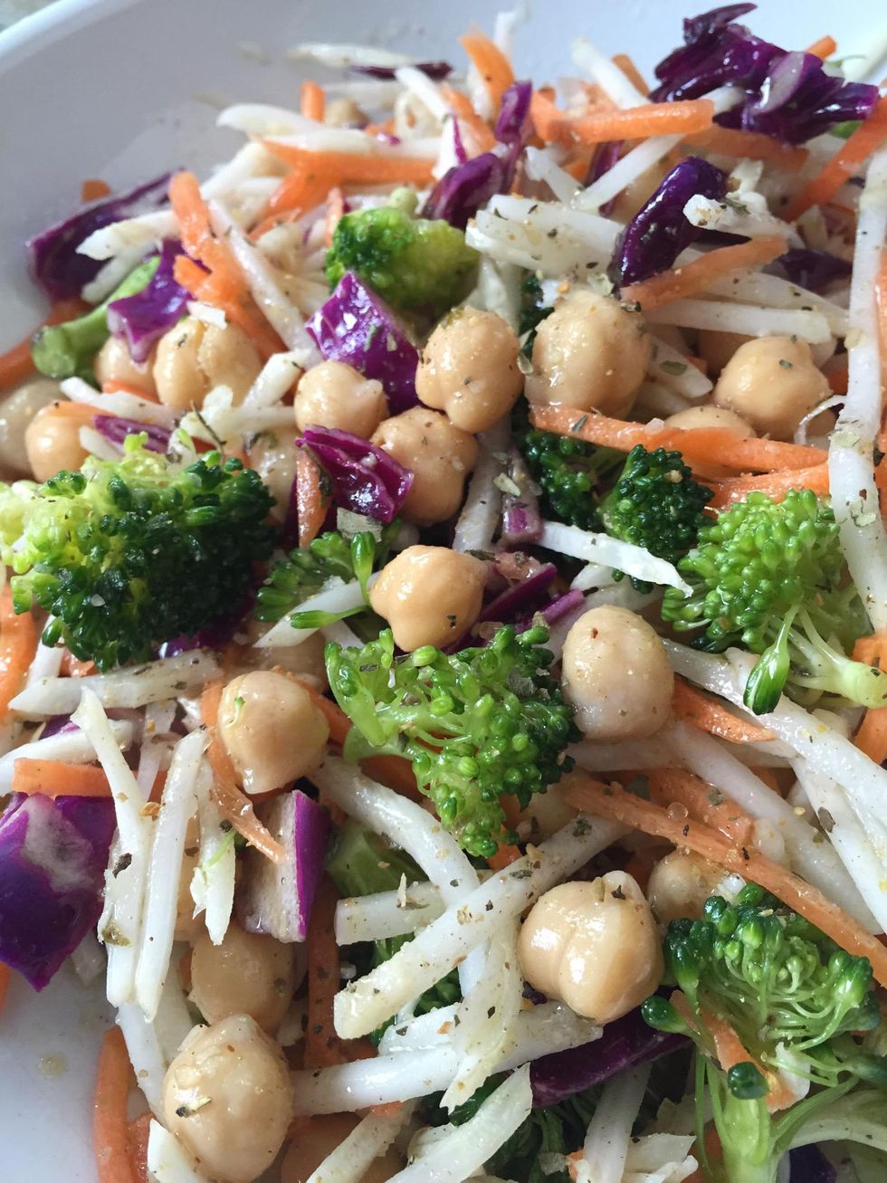 Place the chickpeas and veggies in a bowl and add your dressing. Mix well and let sit for an hour in the fridge for best flavor, but at least 10 minutes for the veggies to soak in some of the flavor.