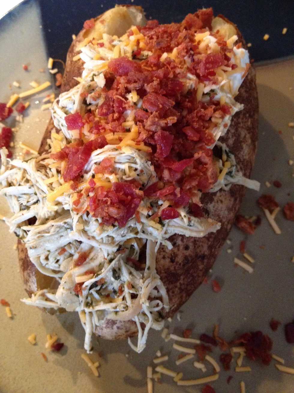 Using tongs, toss the chicken a bit in the broth and then grab some and let it drain a bit. Add it to the potatoes and then sprinkle with bacon crumbles and shredded cheese.