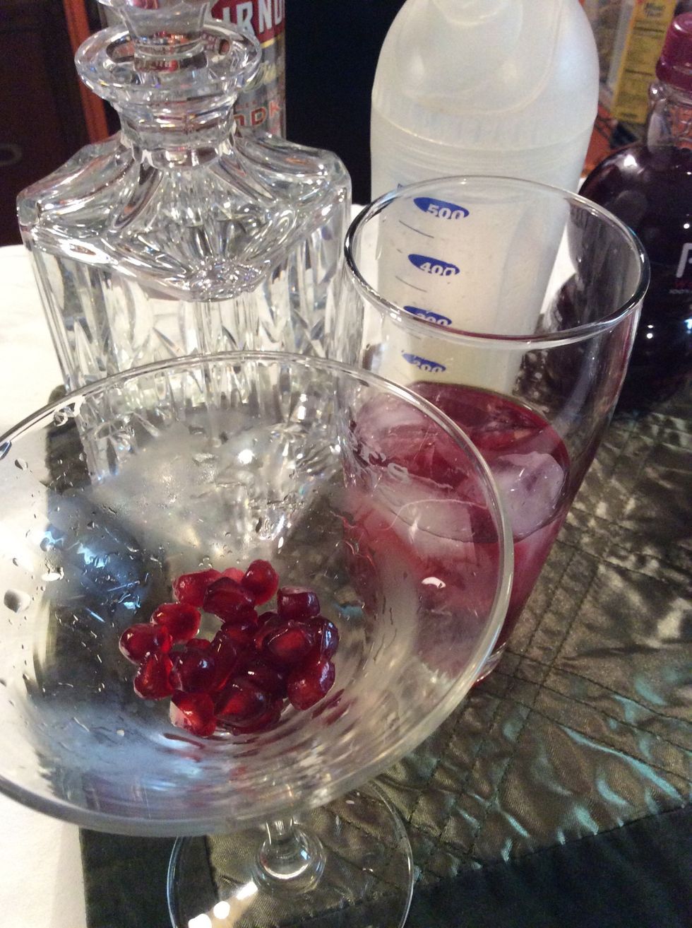 Gathered ingredients; Vodka, Pom juice, simple syrup, fresh squeezed lime juice, fresh separated pomegranate seeds and a chilling martini glass.