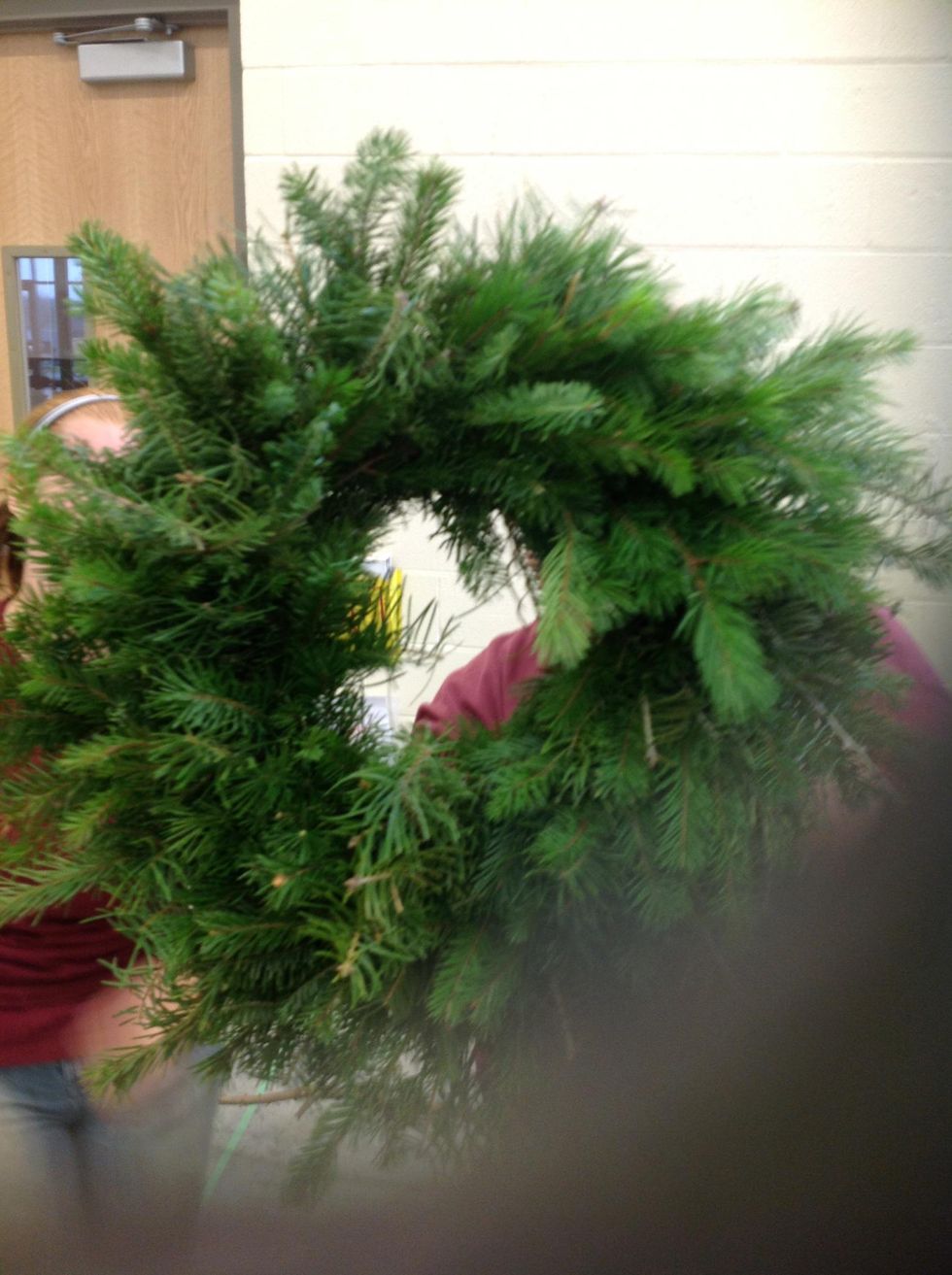 The second step is to collect big pieces of pine, bunch it together and lie it in the wreath frame.