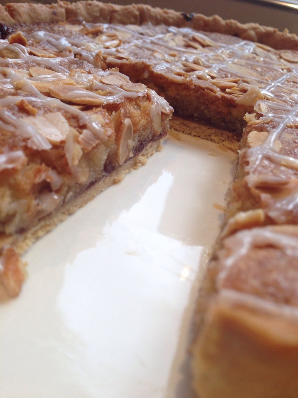 Pour the almond mix into the pastry and cover the jam. Sprinkle flaked almonds over the top