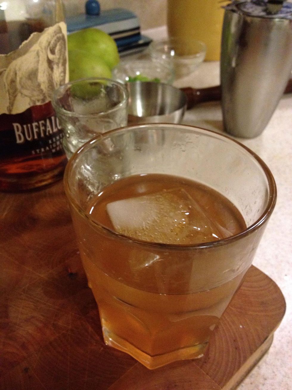 Pour two ounces of some delicious bourbon in the shaker.