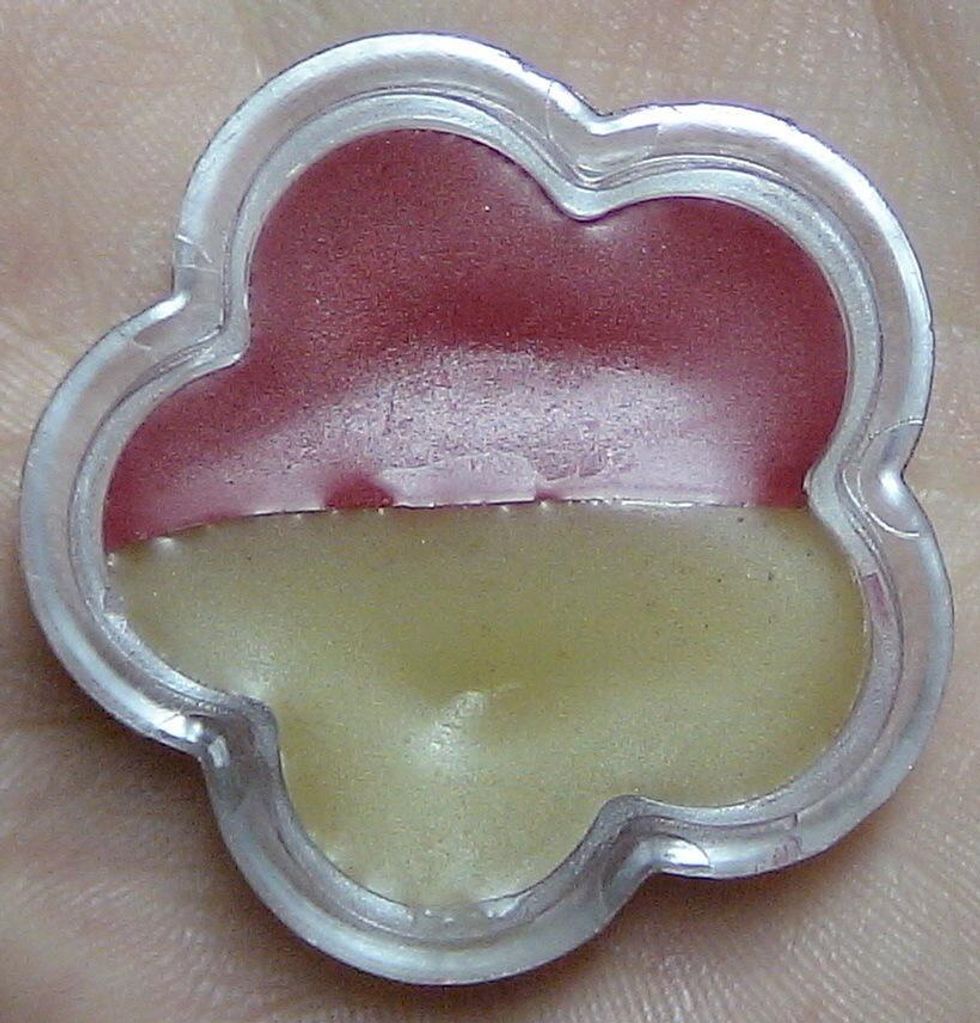 RUBY: 4 scoops red or red mica (1/8 tsp), 1 scoop white satin mica (5% colour to base) Add up to 2 scoops titanium dioxide for a more opaque balm. Squish very very well so you see no white streaks.