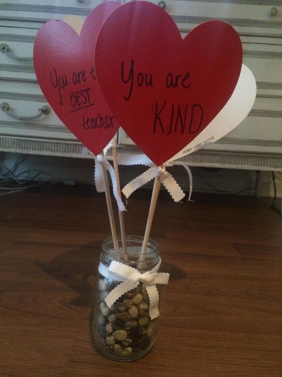 Stick the red hearts into the mason jar. Now you have a beautiful bouquet of compliment hearts for your teacher's desk!