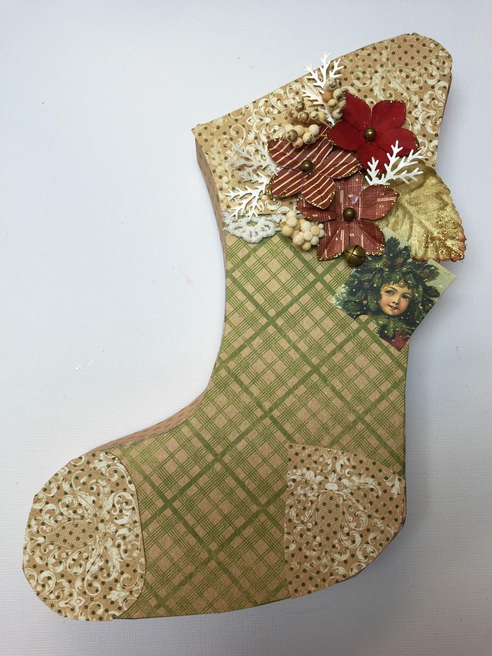 Using the remnant of your double sided paper cut matching cuff and trims for your stocking. Scrapbook paper gives you a coordinated pattern on the back! Check out the Tiding Collection by Authentique