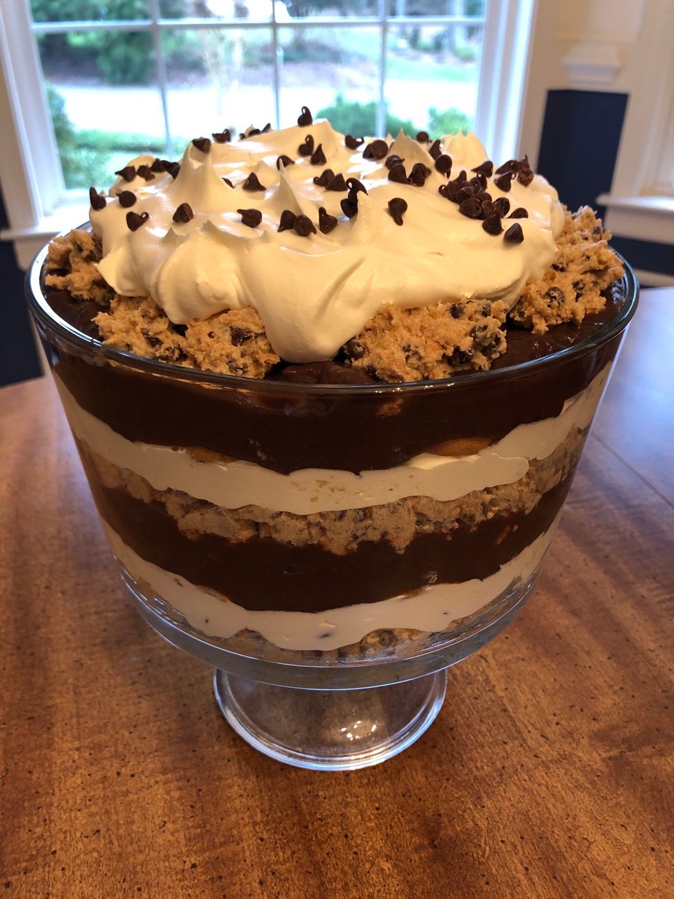 In a trifle dish, scoop 1/3 of the cookie dough mixture into the bottom and spread evenly. Add 1/3 whipped cream mixture on top.