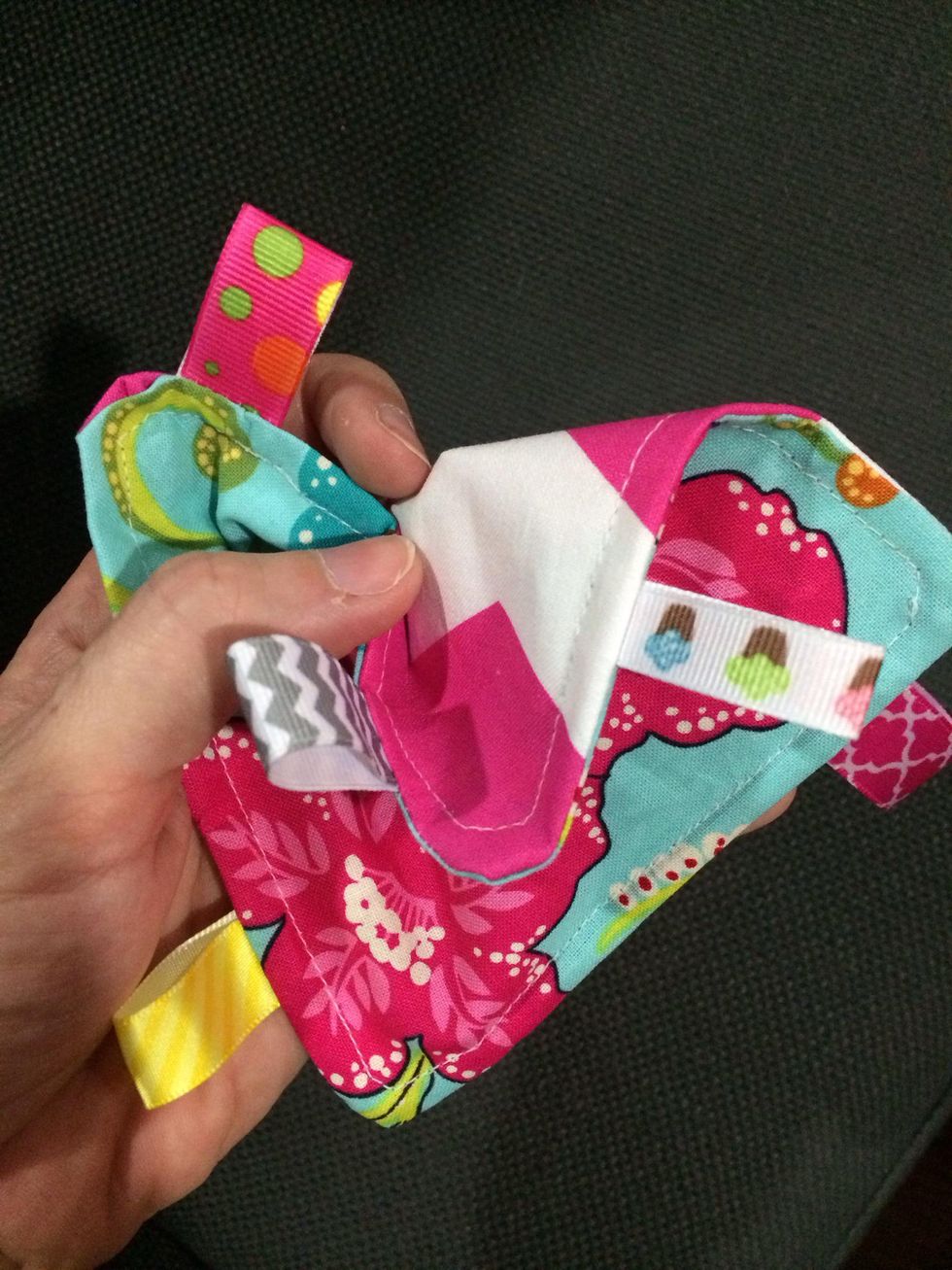 You will need to cut two pieces of fabric 6 inch square and have several 4 inch strips of ribbon. Also cut a 6 inch square of plastic that makes noise when you crumple it.
