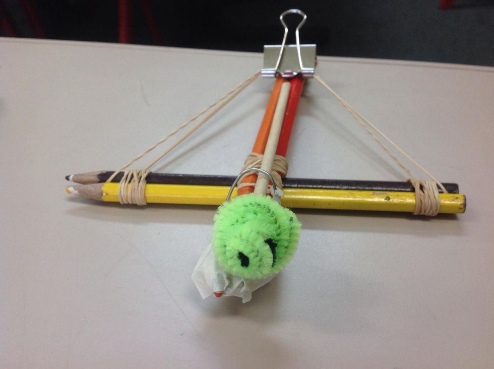 Now, place an elastic band in between to pencils on either side of them then pull the elastic band back and hold it with the bulldog clip.