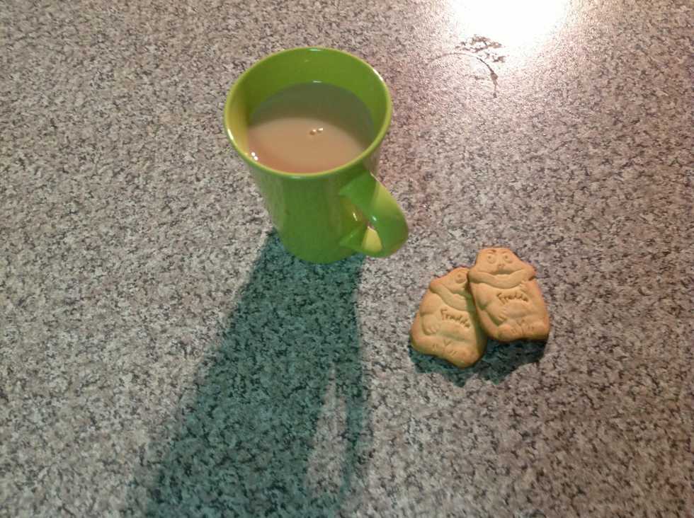 Flick the kettle onAdd a tea bagSome sweetenerPour the hot water in the cupRetrieve the tea bag chord...Add milkBiscuits optional