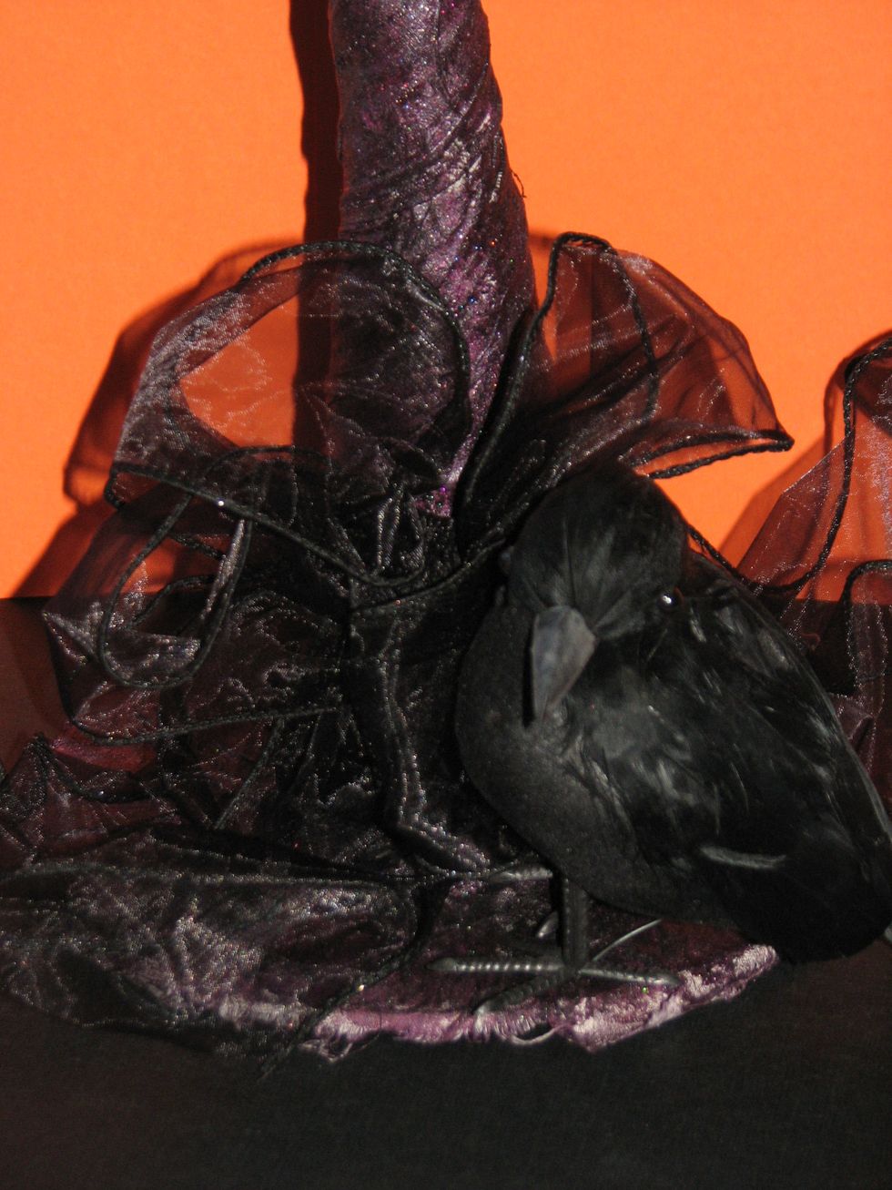 Embellish the hat to fit your decor/theme. Here I simply added 2" wired black ribbon and a raven for a simple Halloween look.