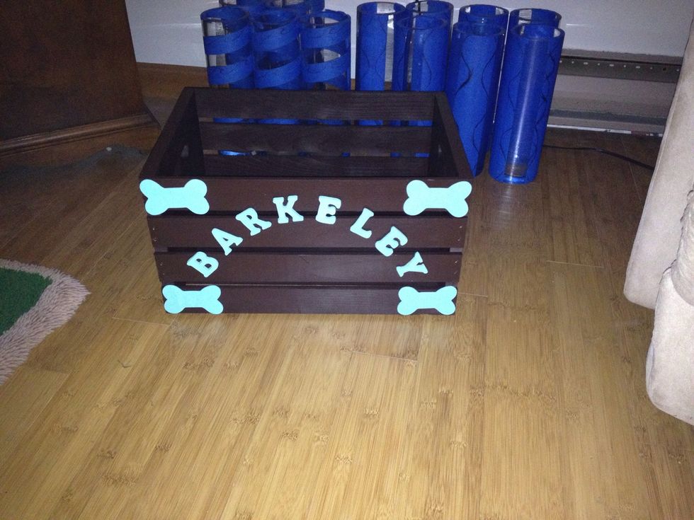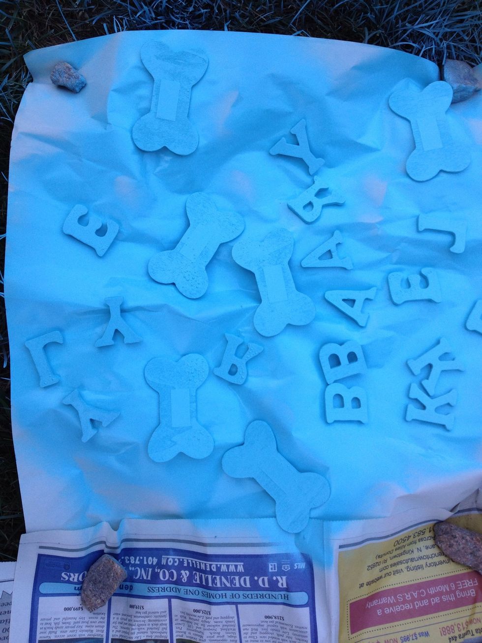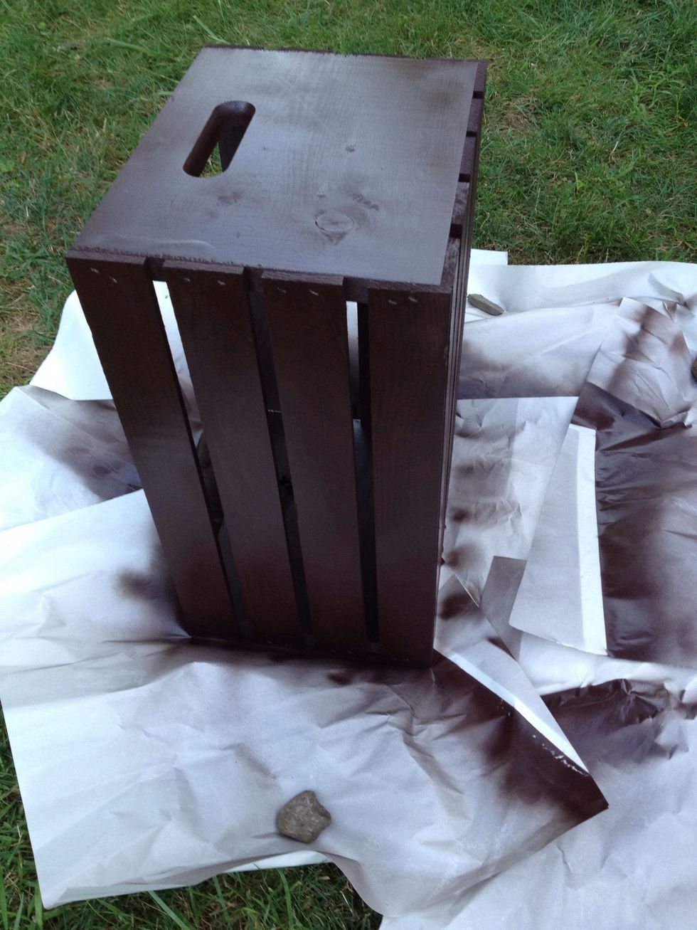 Once you have picked out your colors and decorations place the lettering and crate each on separate pieces of weighted down newspaper ( I used rocks)