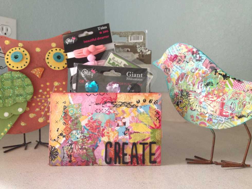 Here is the finished box with some scrapbook supplies inside. I did the cute bird next to it the same way.