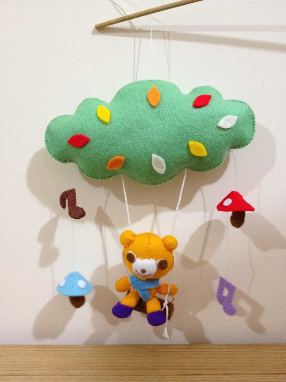 Stick pieces of leaves, in different colors, on both sides of the tree. Place both fishing lines and white strings inside the tree. Sew up and stuffed the tree!