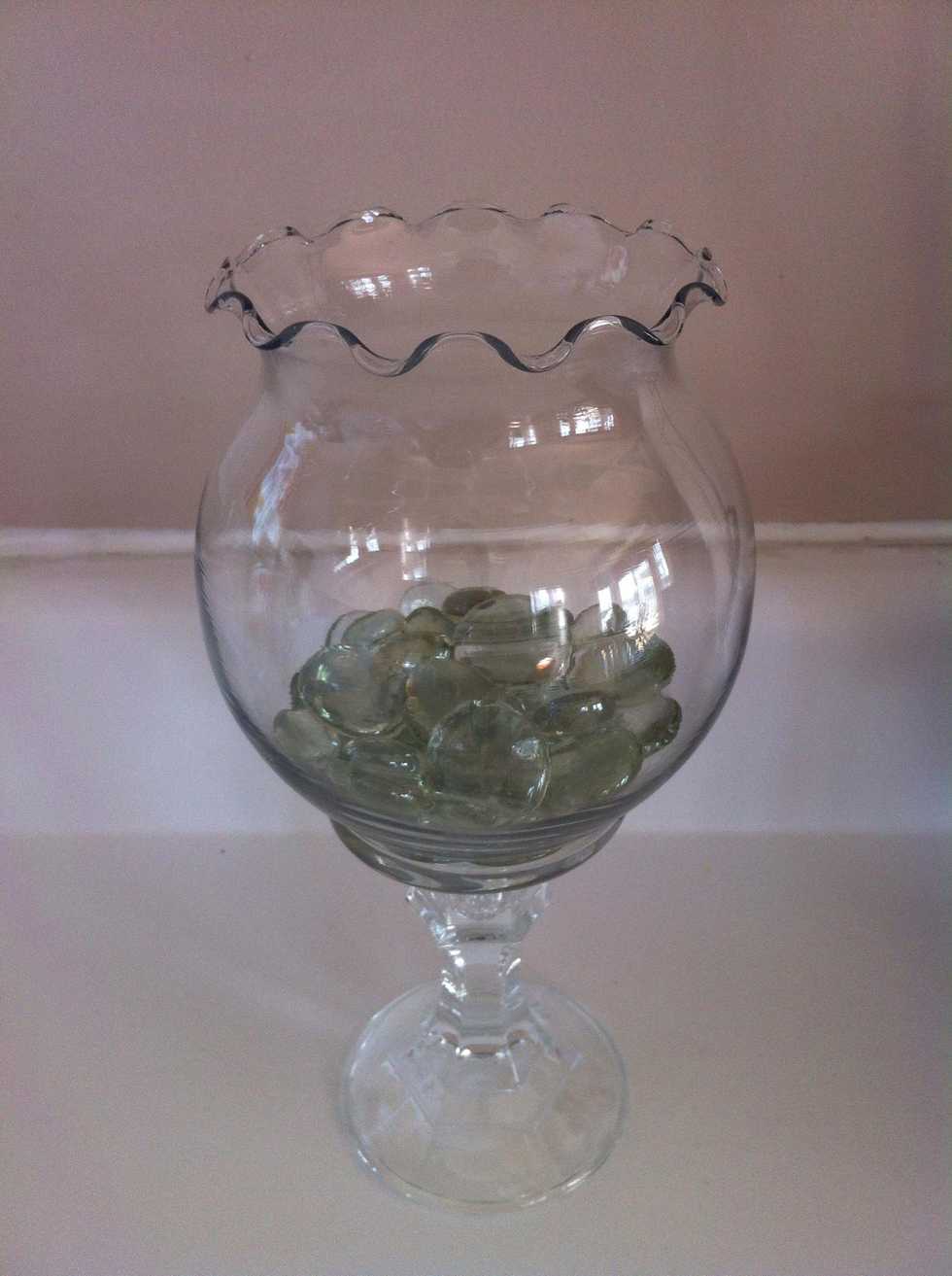 Next take whatever you want to fill your centerpiece with and fill it! (I got these glass pebbles from my local dollar store)