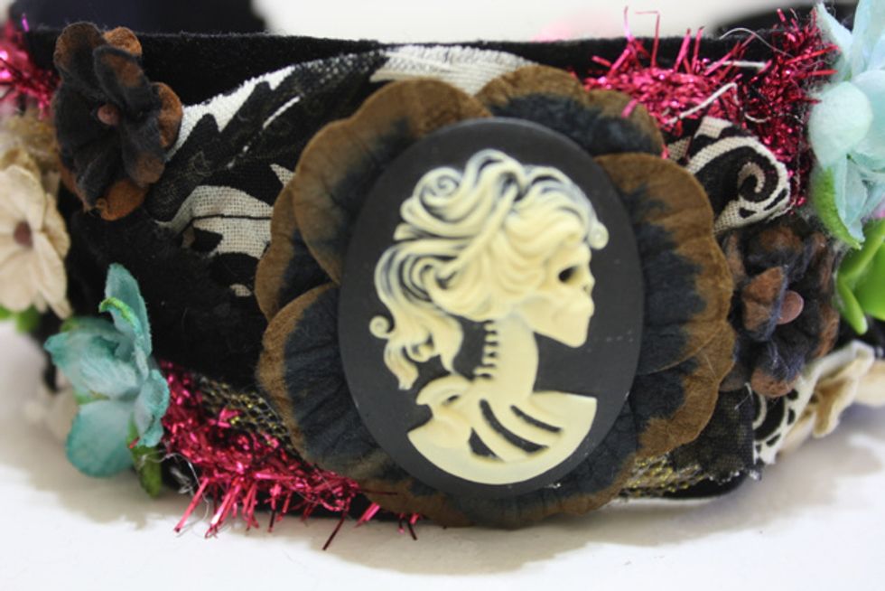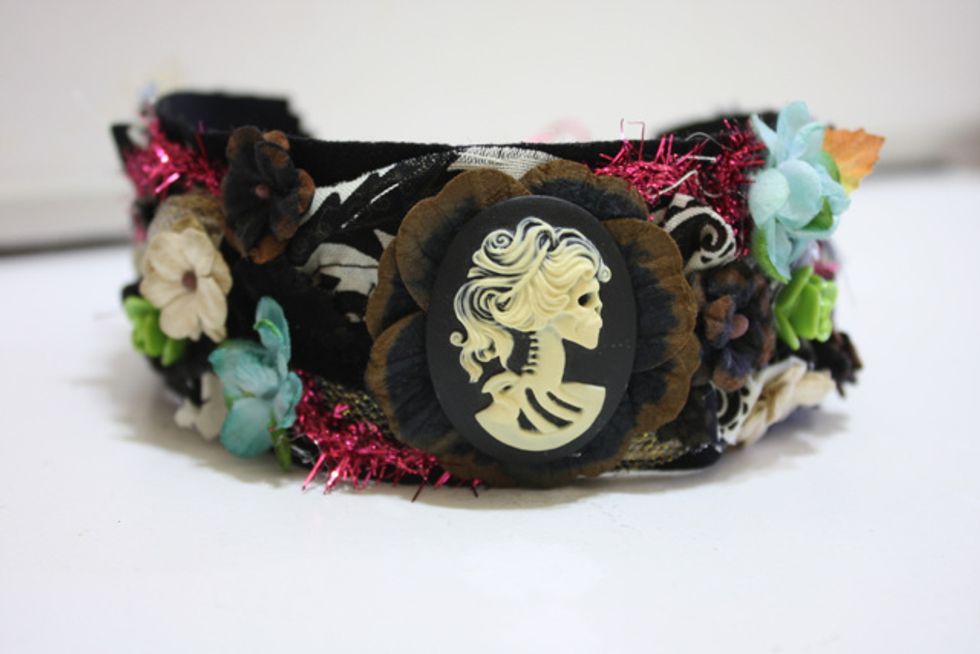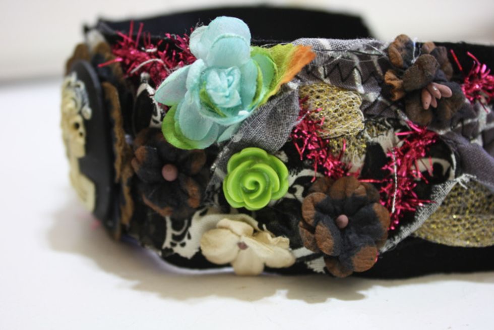 Now I grabbed all my flowers and brads and started gluing them on. Remember only the front 4-5 inches will show so focus your best parts there