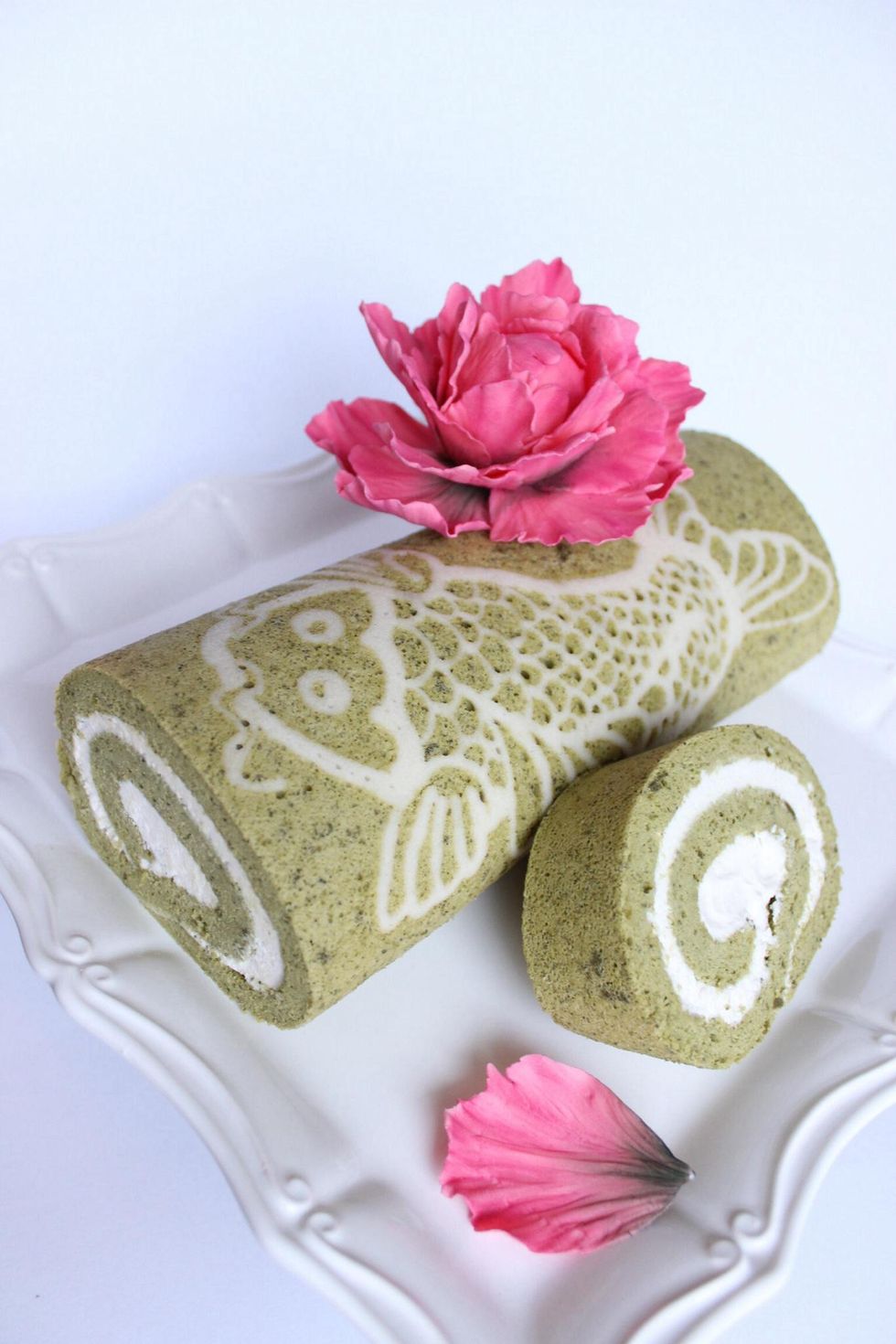 Complete recipe and instructions to decorate, bake, fill and assemble a matcha (green tea) flavoured cake roll with créme chantilly (vanilla whipped cream)