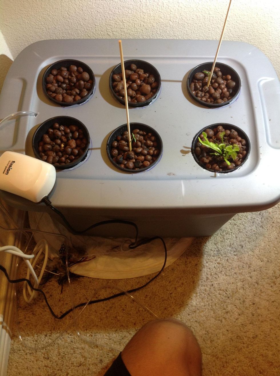 Plug in air pump. Your setup should look like this, you can add support sticks if desired. You will have to manually water the plants till the tip of their roots submerge into the water.