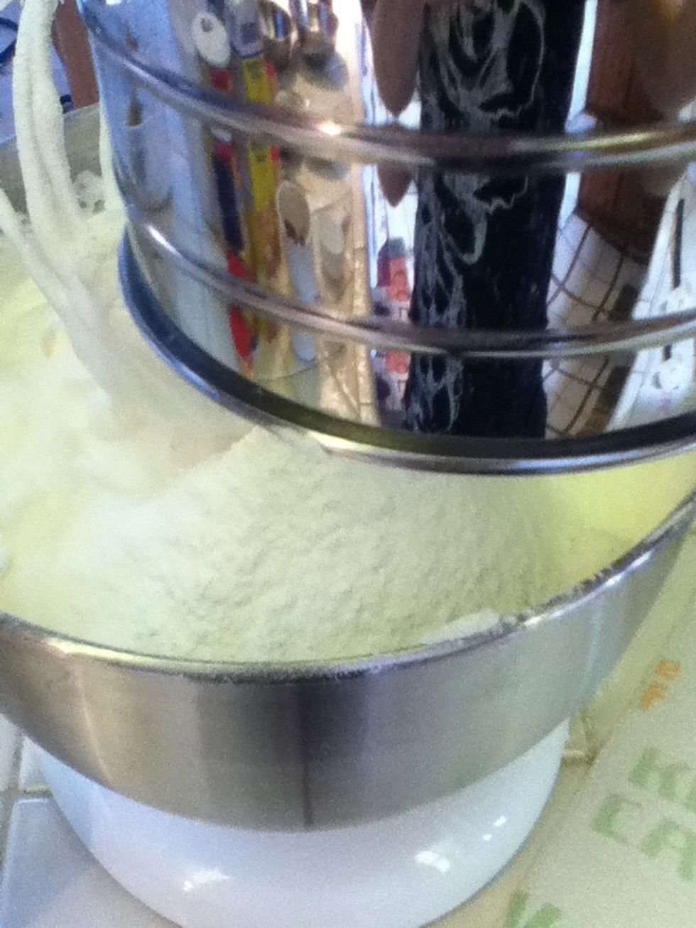 Remember the other half of that sugar? Gradually pour it in with the egg whites. Continue to beat for about 5 minutes until soft peaks form.