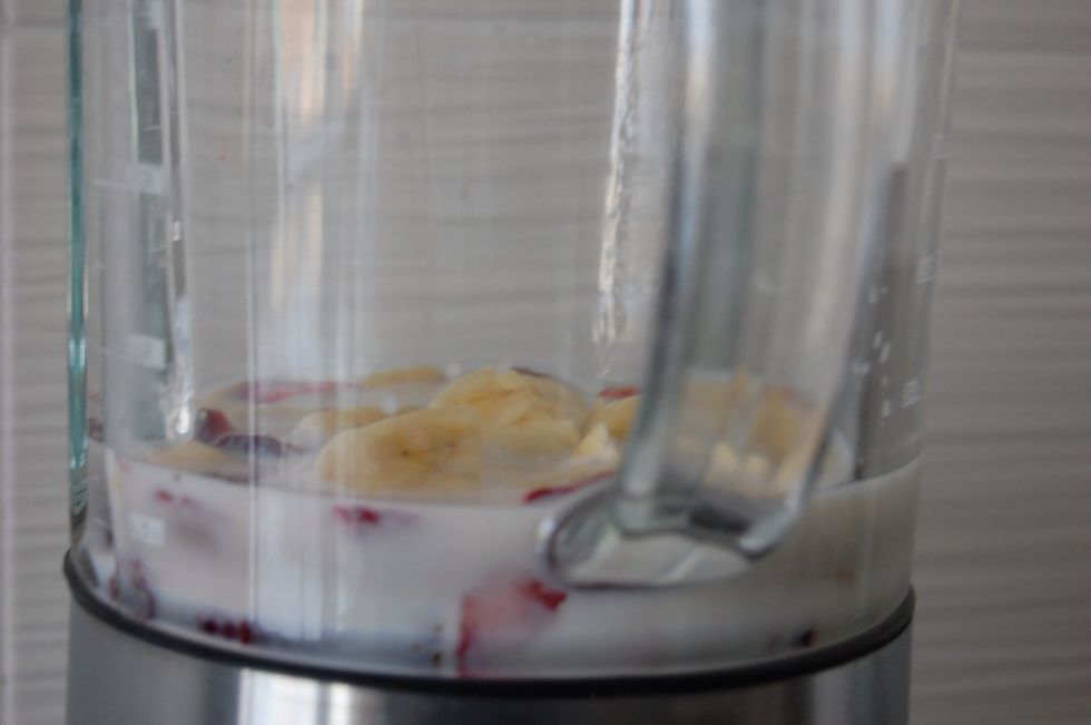 Choose the glass or cup you will be serving your smoothie in, and fill it 3/4 with milk.