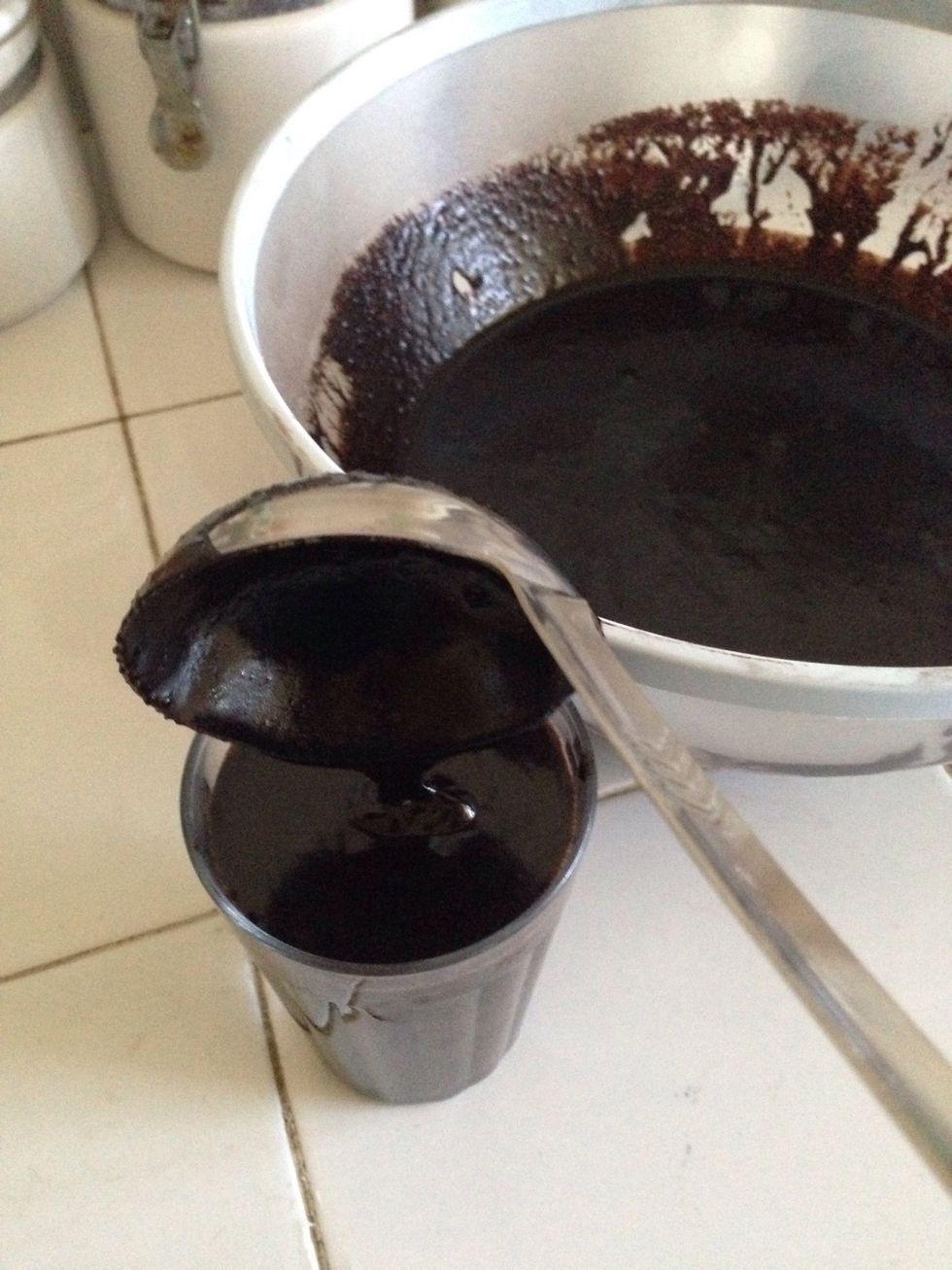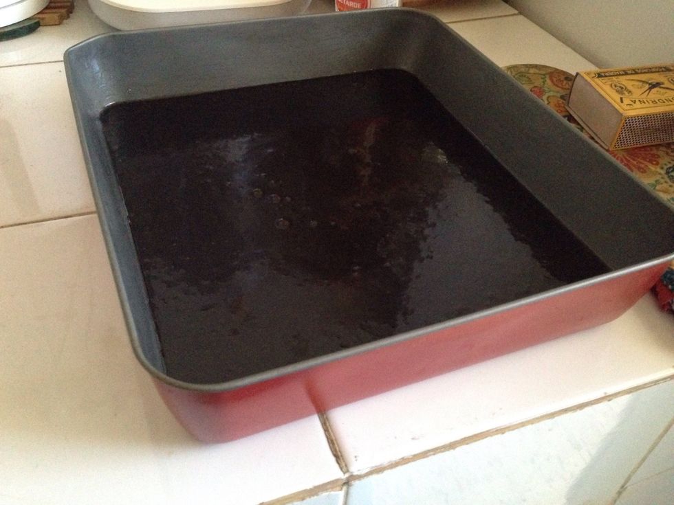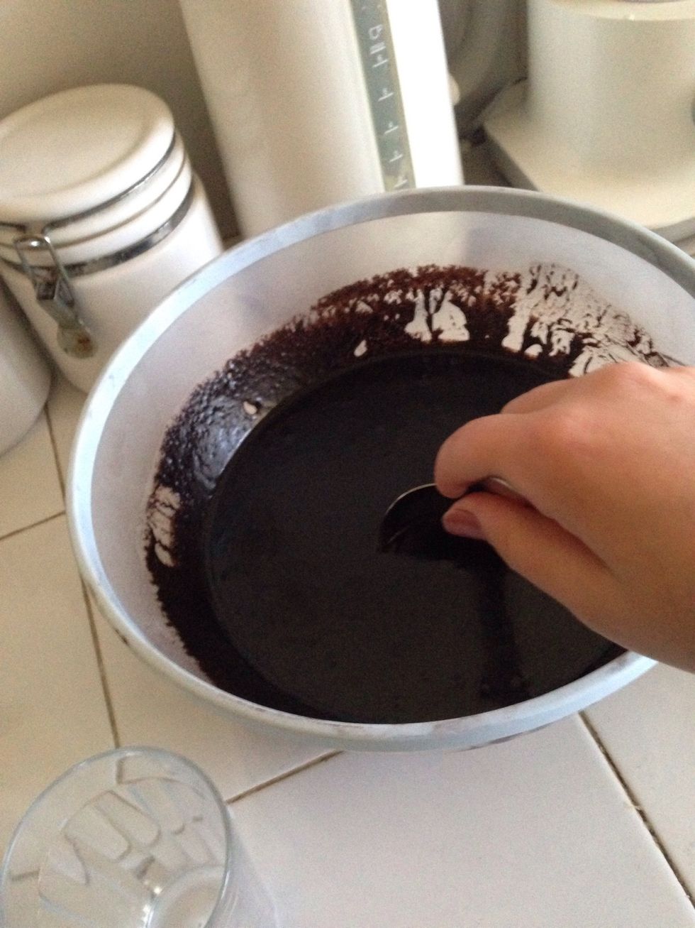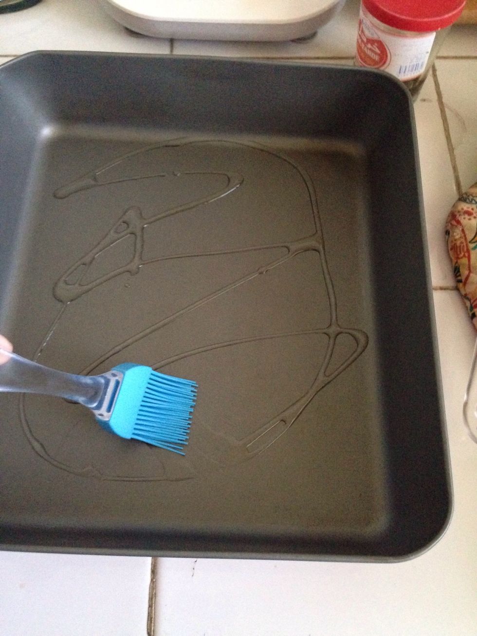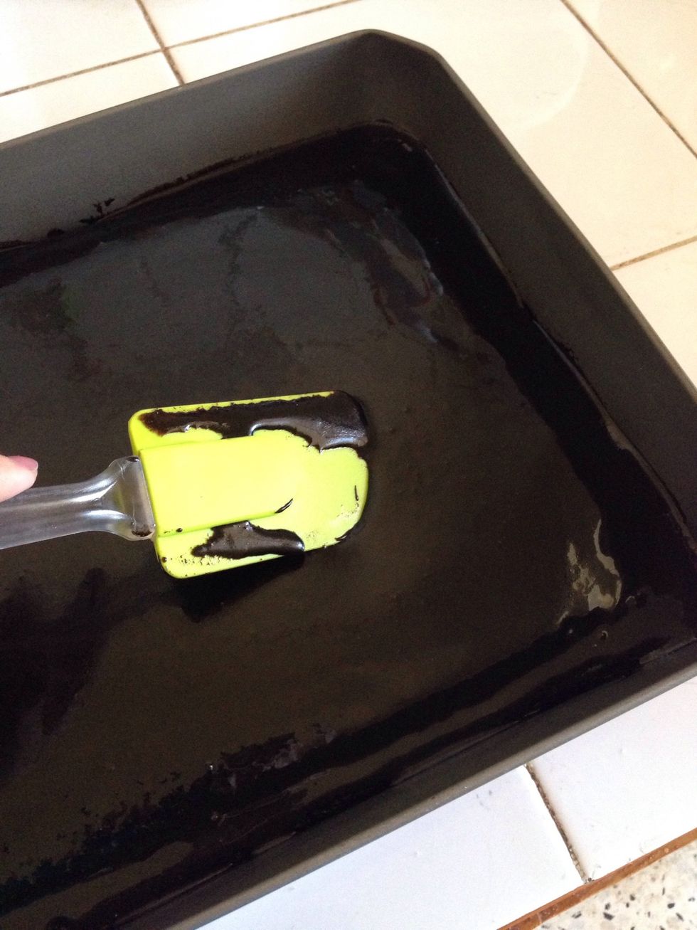 When it's cooked pull it out of the oven since it's hot pour the the cup of the mixture we left before and spread it well using a spatula