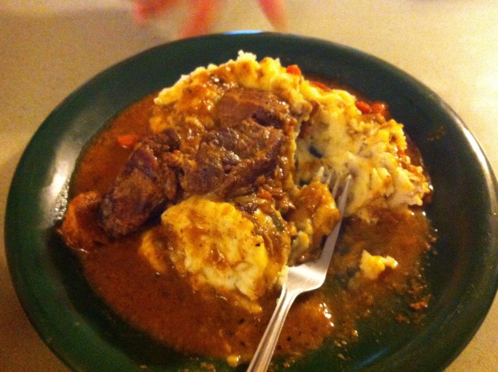 Here is the finished product. Beef stew served over mashed potatoes. My onions and carrots were mostly cooked into the sauce. If you want some chunky vegetables add them about 1 hour before serving.