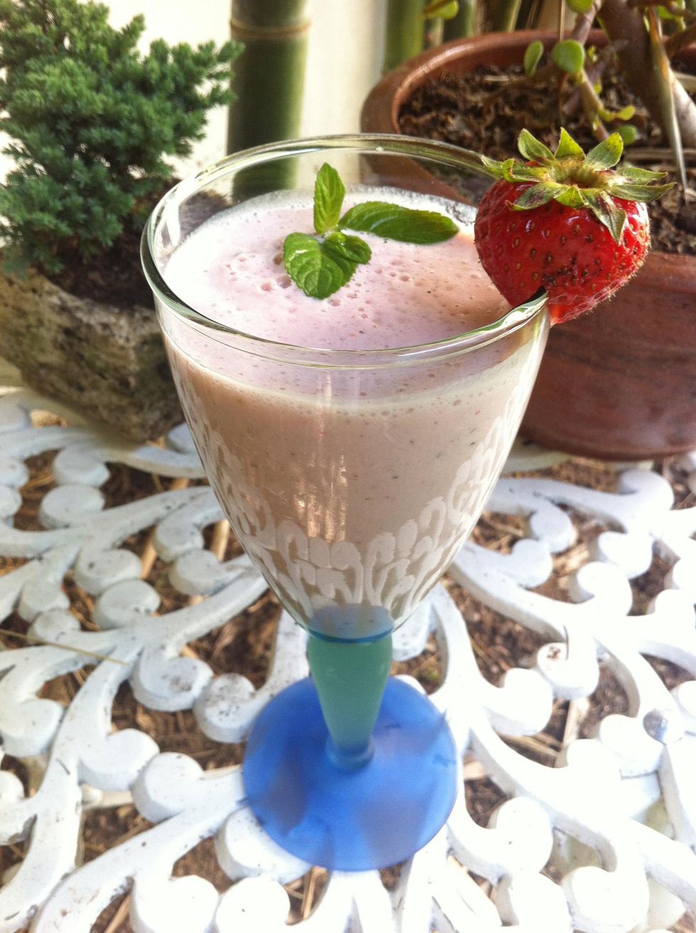 Sirve en un vaso o copa y decora con una fresa y hojitas de menta. si es de tu jardín, mejor ;-). / Pour in a glass and decor with a strawberry and mint leaves, if it's from your garden, the best ;-)