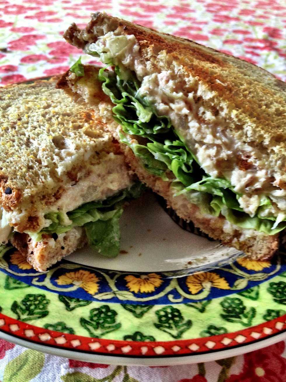 I toast my bread & spread a bit more mayonnaise on each slice. If you're making this sandwich to eat later, put lettuce on each slice with the tuna in the middle. That way the bread won't get soggy.