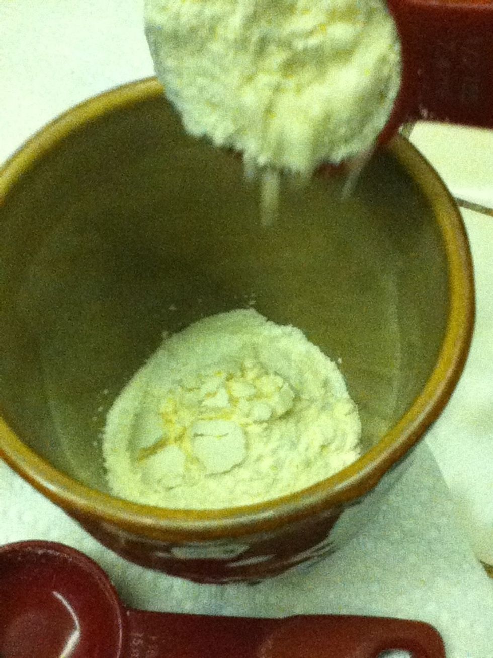 Take the spoon and stir the ingredients. Make sure all of the lumps and dry areas are out. It helps to scrape the bottom and sides a little.