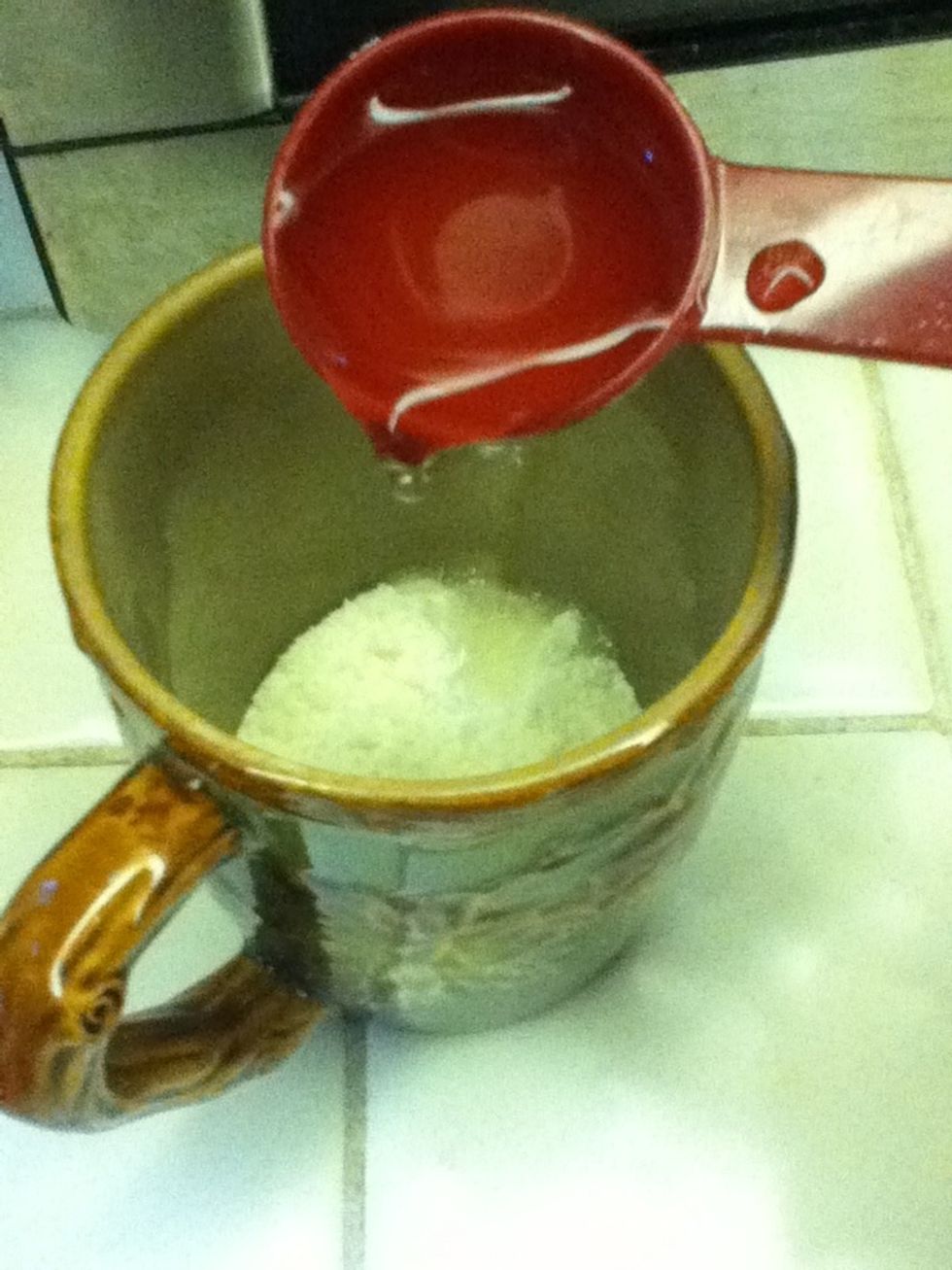 Start by measuring 1 1/2 tablespoons of the angel food cake mix. It is important to make sure that it is angel food mix, since this is what makes the cake rise. Pour it into the mug.