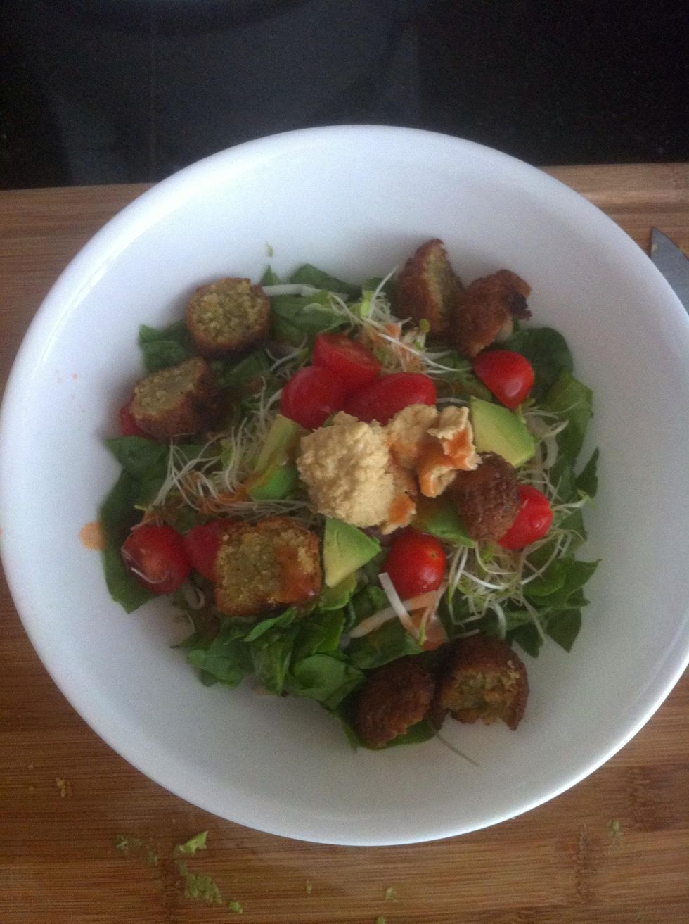 Put quinoa in bowlAdd spinnachAdd all sproutsAdd tomatoes, i like to cut them in halfAdd avocadoAdd fallafelAdd hummusAdd franks red hot sauceMix up and enjoy! It is SOOO yummy!!!